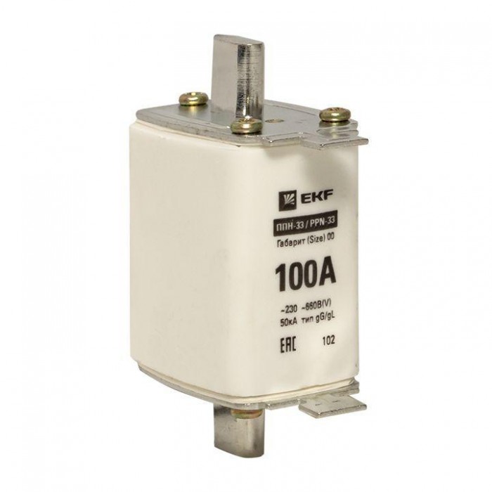 Плавкая вставка ППН-33 160/100А габарит 00 EKF. Предохранители плавкие ППН EKF, укомплектованные плавкими вставками типа gG/gL, предназначаются для защиты кабельных линий и промышленных электроустановок от токов перегрузки и короткого замыкания. Предохранители применяются в электрических сетях переменного тока частотой 50 Гц с напряжением до 660В. Применяются для крепления в распределительных и вводно-распределительных устройствах. Предохранители плавкие ППН могут устанавливаться в основание с держателем, а также в специально предназначенные рубильники. В комплект поставки предохранителей плавких ППН основание с держателем не входит и приобретается отдельно.