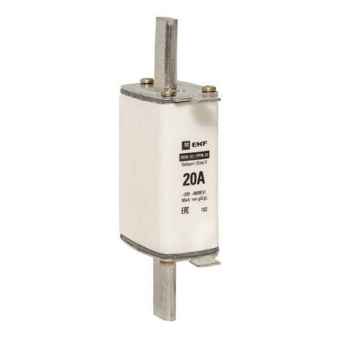 Плавкая вставка ППН-33 160/ 20А габарит 0 EKF. Предохранители плавкие ППН EKF, укомплектованные плавкими вставками типа gG/gL, предназначаются для защиты кабельных линий и промышленных электроустановок от токов перегрузки и короткого замыкания. Предохранители применяются в электрических сетях переменного тока частотой 50 Гц с напряжением до 660В. Применяются для крепления в распределительных и вводно-распределительных устройствах. Предохранители плавкие ППН могут устанавливаться в основание с держателем, а также в специально предназначенные рубильники. В комплект поставки предохранителей плавких ППН основание с держателем не входит и приобретается отдельно.