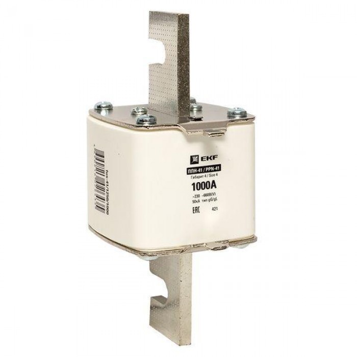 Плавкая вставка ППН-41 1250/1000А габарит 4 EKF. Предохранители плавкие ППН EKF, укомплектованные плавкими вставками типа gG/gL, предназначаются для защиты кабельных линий и промышленных электроустановок от токов перегрузки и короткого замыкания. Предохранители применяются в электрических сетях переменного тока частотой 50 Гц с напряжением до 660В. Применяются для крепления в распределительных и вводно-распределительных устройствах. Предохранители плавкие ППН могут устанавливаться в основание с держателем, а также в специально предназначенные рубильники. В комплект поставки предохранителей плавких ППН основание с держателем не входит и приобретается отдельно.