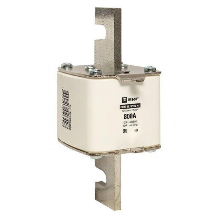 Плавкая вставка ППН-41 1250/ 800А габарит 4 EKF. Предохранители плавкие ППН EKF, укомплектованные плавкими вставками типа gG/gL, предназначаются для защиты кабельных линий и промышленных электроустановок от токов перегрузки и короткого замыкания. Предохранители применяются в электрических сетях переменного тока частотой 50 Гц с напряжением до 660В. Применяются для крепления в распределительных и вводно-распределительных устройствах. Предохранители плавкие ППН могут устанавливаться в основание с держателем, а также в специально предназначенные рубильники. В комплект поставки предохранителей плавких ППН основание с держателем не входит и приобретается отдельно.