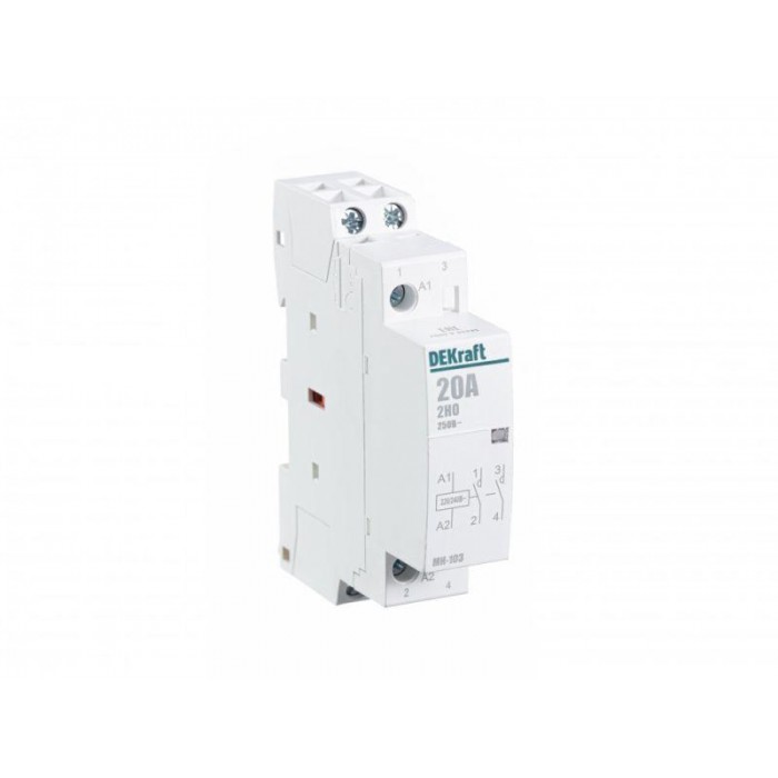 Модульный контактор серии МК-103 Dekraft; ном.ток 20 А (АС-7а); кол-во и исполнение контактов – 2НО; напряжение управления 220 В пер.тока; ширина – 1 мод. х 18 мм; установка – на DIN-рейку. Контакторы МК-103 применяются в сетях напряжением до 400 В пер.тока для дистанционного управления небольшими нагрузками, требующими большого количества включений / отключений, например, насосы, системы вентиляции и т.п. Модульные контакторы не требуют дополнительных настроек и специального обслуживания.