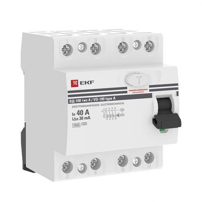 Выключатель дифференциального тока (УЗО) 4п 40А 30мА тип A ВД-100 (электромех.) PROxima EKF elcb-4-40-30-em-a-pro