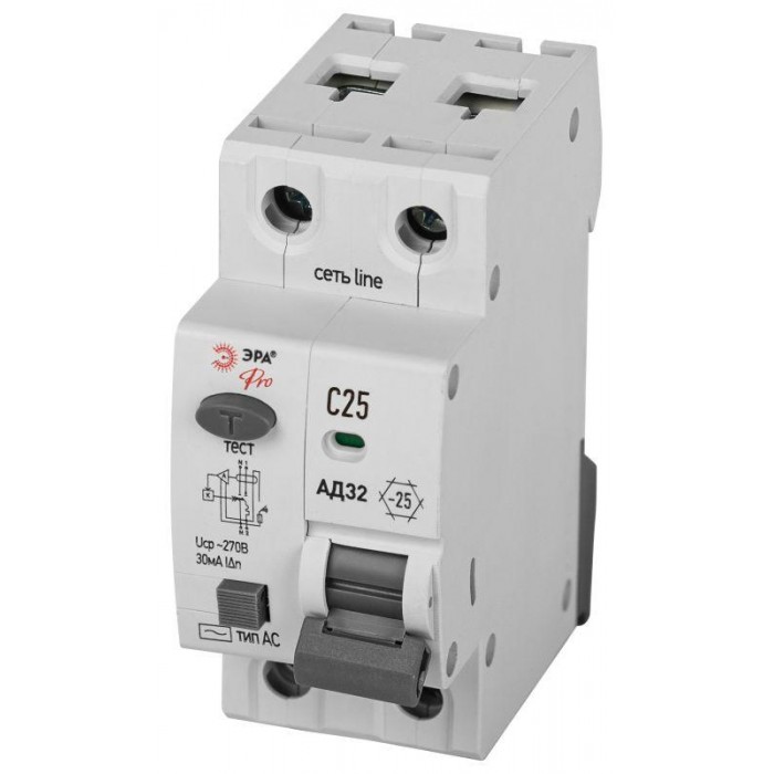 Выключатель автоматический дифференциального тока 1P+N C25 30мА тип АC защита 230В АВДТ 4.5кА PRO D32E2C25АC30P АД32 электронное Эра Б0057352