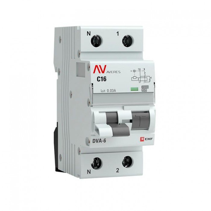 Выключатель автоматический дифференциального тока 2п (1P+N) C 16А 30мА тип A 6кА DVA-6 Averes EKF rcbo6-1pn-16C-30-a-av