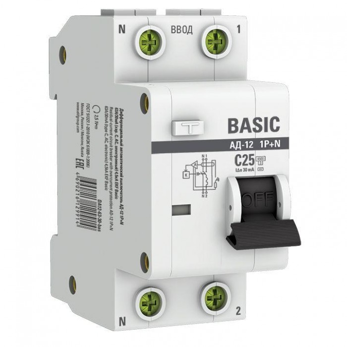Выключатель автоматический дифференциального тока 2п (1P+N) C 25А 30мА тип AC 4.5кА АД-12 Basic EKF DA12-25-30-bas