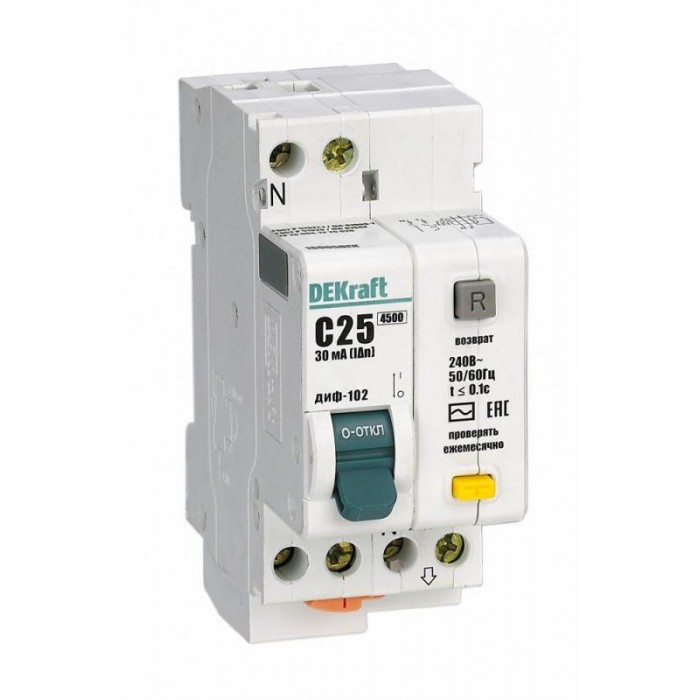 Автоматический выключатель дифференциального тока серии ДИФ-102 Dekraft; 1P+N; ном.ток 25 А; характеристика C; откл.способность Icn = 4,5 kA; ток утечки 30 мА; тип - АС; блок дифф.защиты – электронный; ширина – 2 мод. х ...