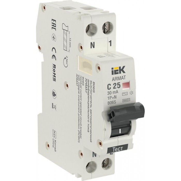 Выключатель автоматический дифференциального тока 2п (1P+N) C 25А 30мА тип AC АВДТ B06S 18мм ARMAT IEK AR-B06S-1N-C25C030