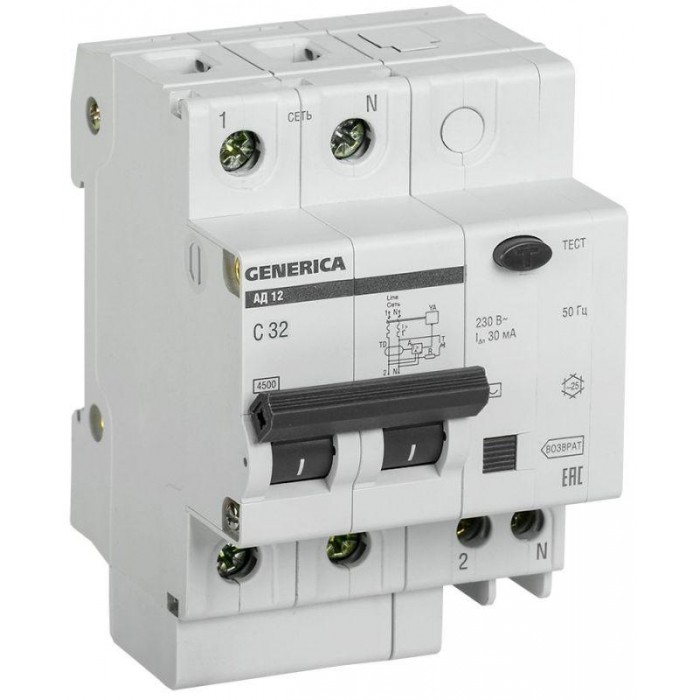 Выключатель автоматический дифференциального тока 2п 32А 30мА АД12 GENERICA MAD15-2-032-C-030
