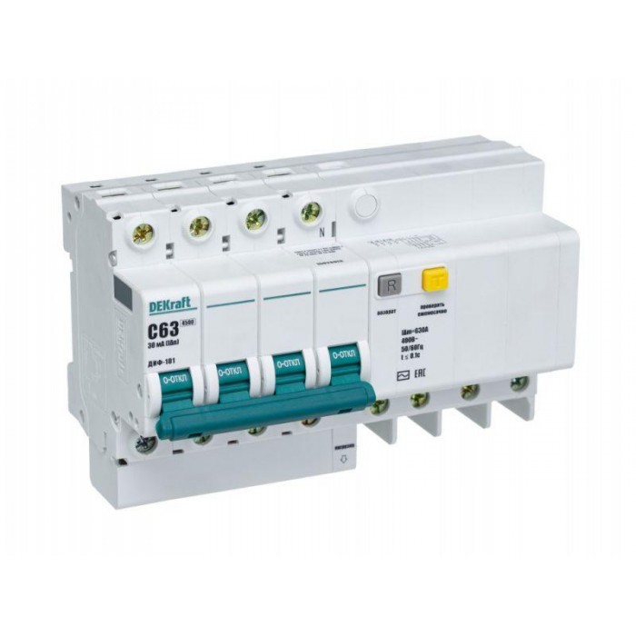 Автоматический выключатель дифференциального тока серии ДИФ-101 Dekraft; 4P; ном.ток 63 А; характеристика C; откл.способность Icn = 4,5 kA; ток утечки 30 мА; блок дифф.защиты – электронный; ширина – 8 мод. х 18 мм; монта...