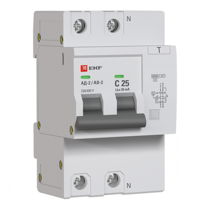 Выключатель автоматический дифференциального тока C 25А 30мА тип AC 6кА АД-2 (электрон.) защита 270В PROxima EKF DA2-6-25-30-pro