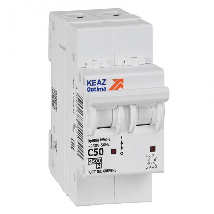 Выключатель автоматический модульный 2п C 50А 4.5кА OptiDin BM63-2C50-4.5-УХЛ3 КЭАЗ 326808