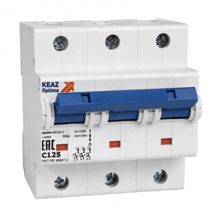 Выключатель автоматический модульный 3п C 125А 15кА OptiDin BM125-3C125-8ln-УХЛ3 КЭАЗ 138546