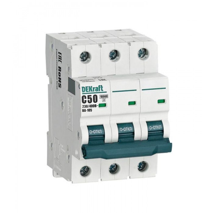 Автоматический выключатель серии ВА-105 Dekraft; 3P; ном. ток 50 А; характеристика C; откл. способность 10 кА; ширина модуля 18мм. Аппараты имеют механизм мгновенной коммутации, 6 монолитных заклепок, которые повышают пр...
