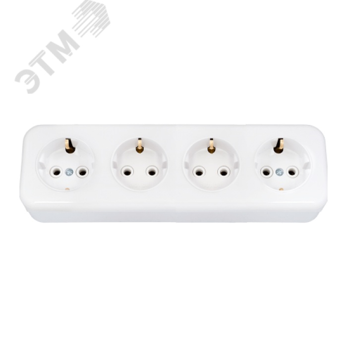 Розетка четырехместная с заземляющим контактом открытой установки, предназначена для присоединения электрических приемников с номинальным напряжением 250 В к электрической сети переменного тока. В качестве материала для производства изделия использовался специальный очень прочный и экологически безопасный полимер. Изделие надёжно защищено от разрушительного воздействия ультрафиолетового излучения, не претерпевает видимых изменений при постоянных многочисленных эксплуатационных контактах. Надёжная контактная группа. Изделие выдерживает 20 А