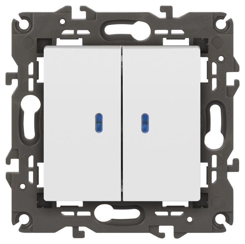 Выключатель 2-клавишный подсветка Эра Elegance белый 14-1105-01. Оснащён автоматическими клеммами дл..