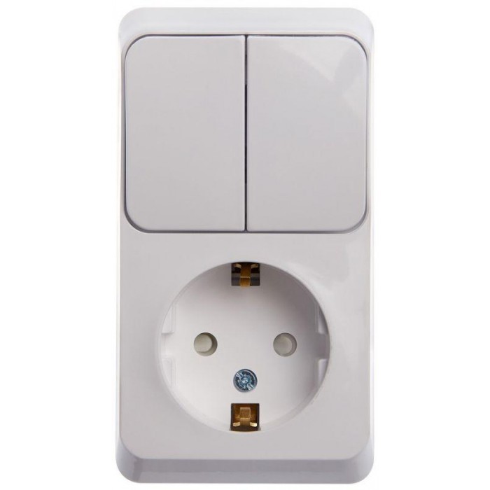 Блок Systeme Electric (ранее Schneider Electric) ЭТЮД (белый, открытой установки) предназначен для применения в сетях до 250В, состоит из розетки на 16А с заземлением и шторками и двухклавишного выключателя на 10А. Две клавиши позволяют управлять двумя источниками света с одной точки. Он удобен в применении и отлично подходит для коридора. Сделано в России.