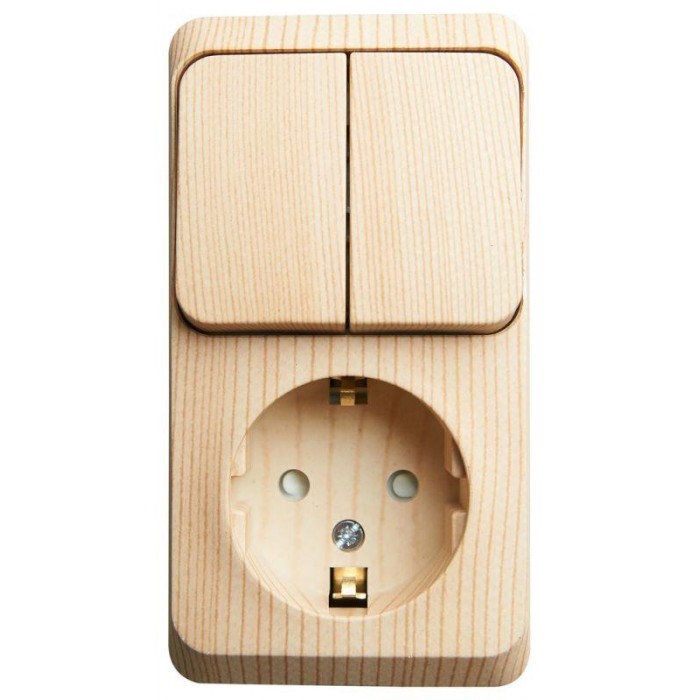 Блок Systeme Electric (ранее Schneider Electric) ЭТЮД (сосна, открытой установки) предназначен для применения в сетях до 250В, состоит из розетки на 16А с заземлением и шторками и двухклавишного выключателя на 10А. Две клавиши позволяют управлять двумя источниками света с одной точки. Он удобен в применении и отлично подходит для коридора. Изделия цвета Сосна обладают уникальным рисунком, напоминающим древесный сруб. Сделано в России.
