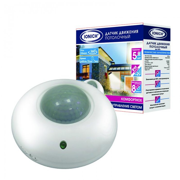 Датчик движения потолочный 8м 1200Вт 7мин бел. IONICH 2201