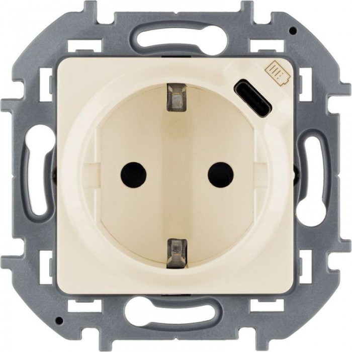 Комбинированная розетка 2К+З с зарядным устройством USB тип С Inspiria для скрытого монтажа, цвет "Слоновая кость". Максимальный ток розетки 16АХ, напряжение розетки ~250В, напряжение зарядного устройства =5В, максимальн...