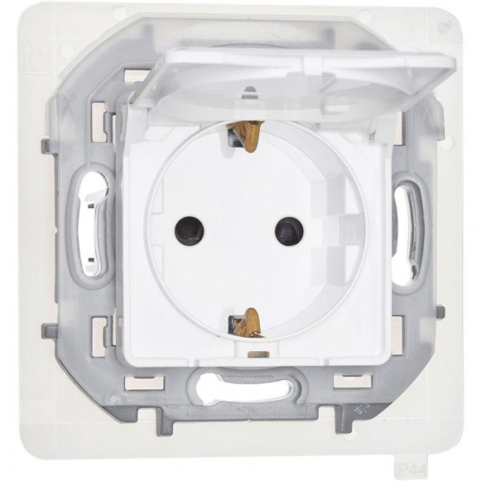 Розетка с заземлением, защитной крышкой и интегрированными защитными шторками для скрытого монтажа Inspiria, степень пылевлагозащиты IP44, цвет "Белый", номинальный ток 16А, напряжение ~250В, максимальная мощность 3680 В...