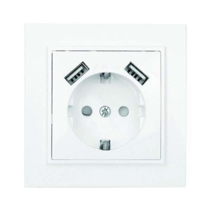 Розетка 1-м СП Минск 16А IP20 с заземл. защ. шторки с 2-мя заряд. устройствами USB 2.1А бел. EKF ERR16-028-100-2USB