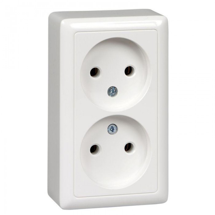 Розетка Systeme Electric (ранее Schneider Electric) ХИТ (открытой установки, цвет белый) двойная без заземления, без шторок предназначена для сетей до 250 В на ток до 16 А. Двойная розетка позволяет подключить два устройства в одном месте. Оптимальное соотношение цены и качества. Сделано в России.