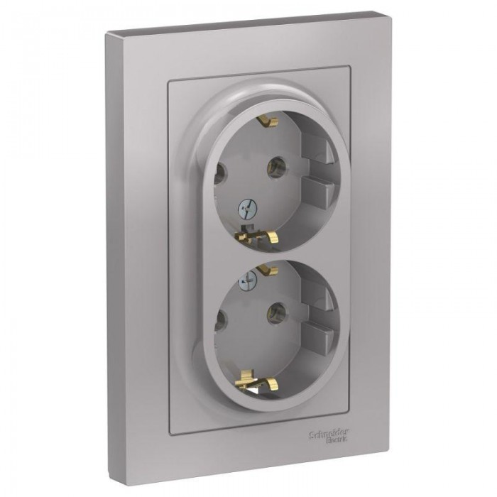 Розетка двойная Systeme Electric (ранее Schneider Electric) серии AtlasDesign (в сборе, цвет алюминий) с заземлением, без шторок подходит для сетей 250 В, на ток 16 А. - Заземляющий контакт обеспечивает дополнительную за...