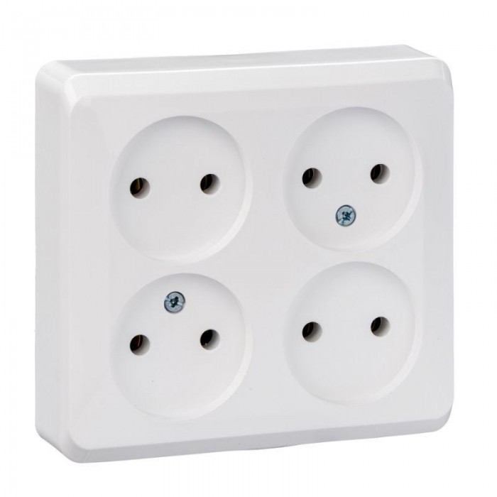 Розетка Systeme Electric (ранее Schneider Electric) ЭТЮД (белый, открытой установки) четырёхместная, без шторок и заземления предназначена для применения в сетях до 250В, на ток до 16А. Четырёхместная розетка позволяет подключить четыре устройства в одном месте. Она проста в установке и удобна в применении. Сделано в России.