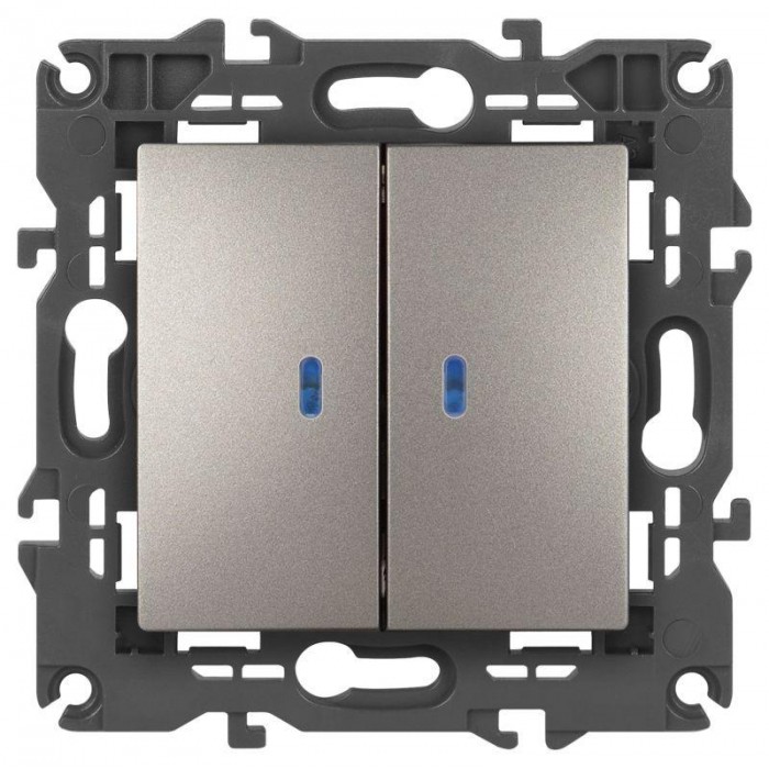 Выключатель 2-клавишный с подсветкой серии Эра Elegance цвет титан 14-1105-16. Характеристики 10А 250В. Оснащён автоматическими клеммами для надёжной фиксации жил кабеля в механизме. Рамки приобретаются отдельно.