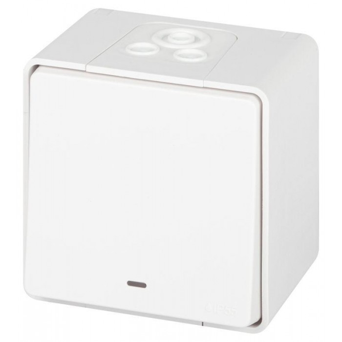 Выключатель влагозащищённый 1-клавишный с подсветкой серии Эра Эксперт накладн IP55 цвет белый 11-1502-01 открытой установки. Номинальные характеристики 10А 250В. Выполнен из качественного поликарбоната, оснащён уникальн...