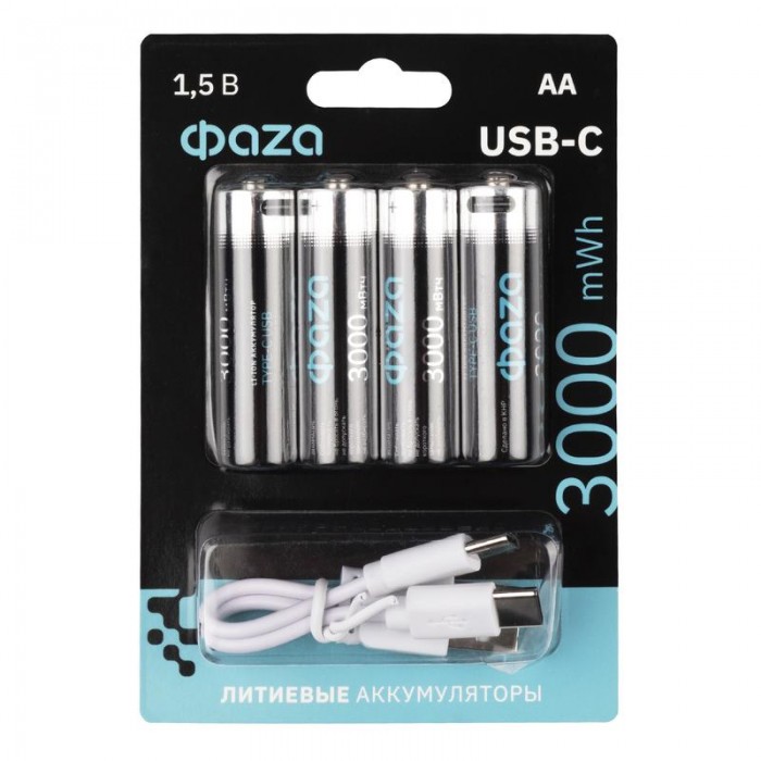 Аккумулятор литиевый AA 1.5В Li-Ion 3000мВт.ч 2000мА.ч зарядка от Type-C шнур в комплекте BL-4 (уп.4шт) ФАZА 5061606 1945678