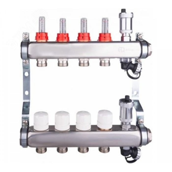 Коллекторная группа AQUALINK состоит из двух коллекторов, изготовленных из нержавеющей стали AISI 304: подающего и принимающего обратный поток среды. Подающий коллектор выполняет функцию настройки системы с помощью расходомеров с градуировкой расхода до 6 л/мин. Коллектор, принимающий обратный поток, снабжен запорно-регулировочными клапанами с возможностью установки сервоприводов. Для бесшумной и длительной эксплуатации систем на обоих коллекторах группы расположены автоматические воздухоотводчики, установленные на отсекающие клапаны, наличие которых позволяет проводить обслуживание воздухоотводчиков без полного слива теплоносителя из системы. Раздвижные кронштейны, входящие в комплект поставки, позволяют использовать коллекторную группу в паре с насосно-смесительными узлами различных модификаций. „Благодаря использованию потайной гайки, конструкция кронштейна имеет плоскую заднюю поверхность, обеспечивающую беспрепятственное осуществление монтажа коллекторной группы.
