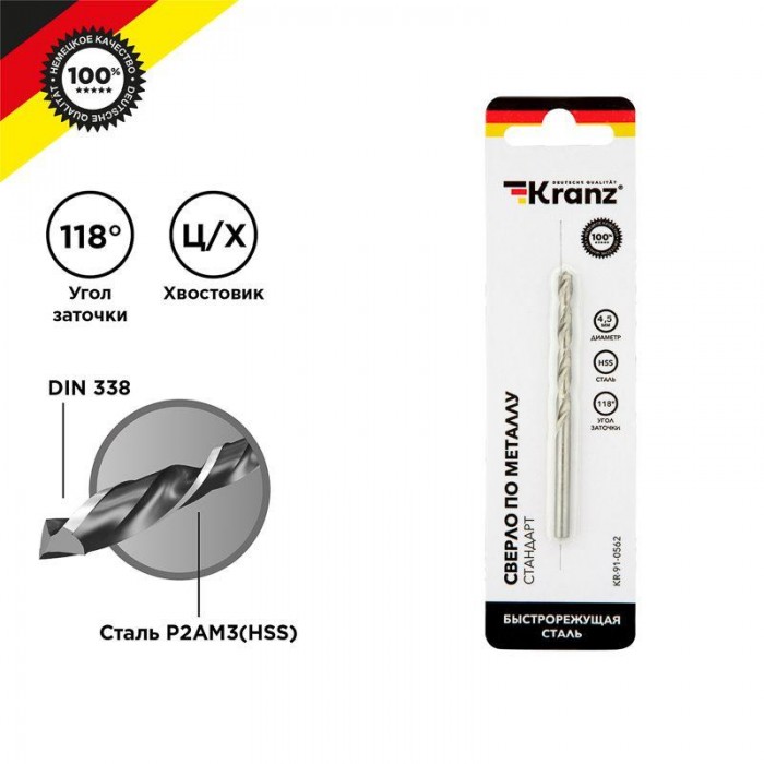 Сверло по металлу 4.5мм HSS DIN 338 (уп.1шт) Kranz KR-91-0562