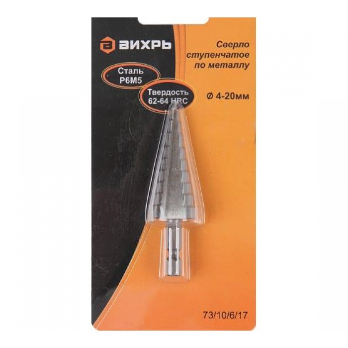 Сверло ступенчатое по металлу 4-6-8-10-12-14-16-18-20мм P6M5 шестигранный хвостовик Вихрь 73/10/6/17