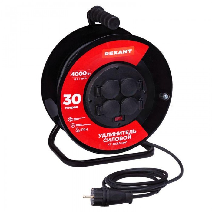 Удлинитель на метал. катушке 4х30м с заземл. IP44 КГ 3х2.5кв.мм с выключателем с защ. крышками Rexant 13-5014