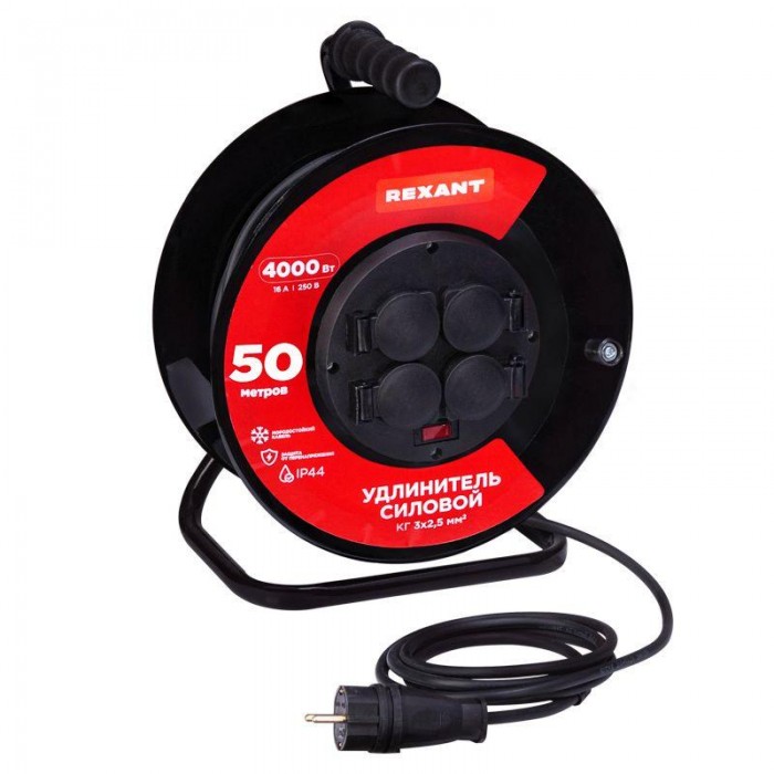 Удлинитель на метал. катушке 4х50м с заземл. IP44 КГ 3х2.5кв.мм с выключателем с защ. крышками Rexant 13-5016