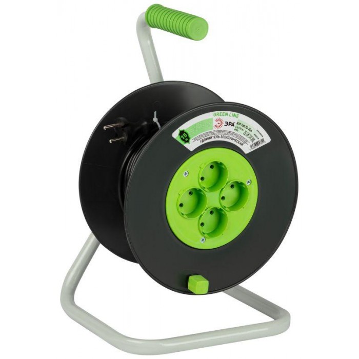 Удлинитель силовой ЭРА GREEN LINE на пластиковой катушке KAT-2x0.75-15m, 4 розетки без заземления. Провод ПВС 2х0,75мм2, 15м. Мощность 6А/1300Вт. Используется для работы на строительных площадках или дачных участках. Удо...