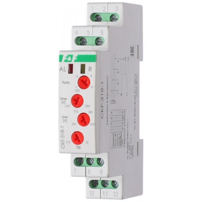 Реле контроля наличия и чередования фаз CKF-318-1 (контроль чередования; слипания фаз; регулировка верх. и нижн. порога напряжения; регулировка задержки отключения; 1 модуль; монтаж на DIN-рейке)(аналог РНПП-311М) F&F EA04.002.007