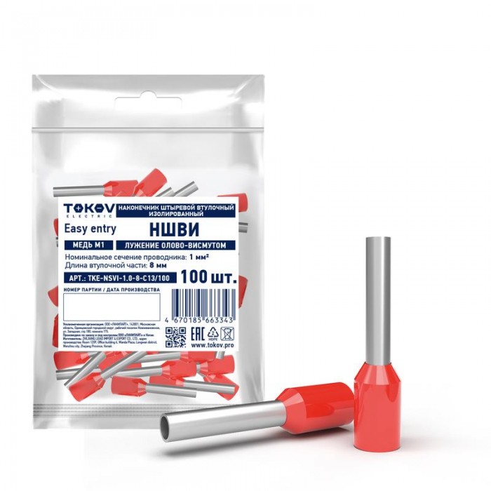 Наконечник штыревой втулочный изолированный НШВИ 1.0-8 TOKOV ELECTRIC TKE-NSVI-1.0-8-C13/100 1800973...