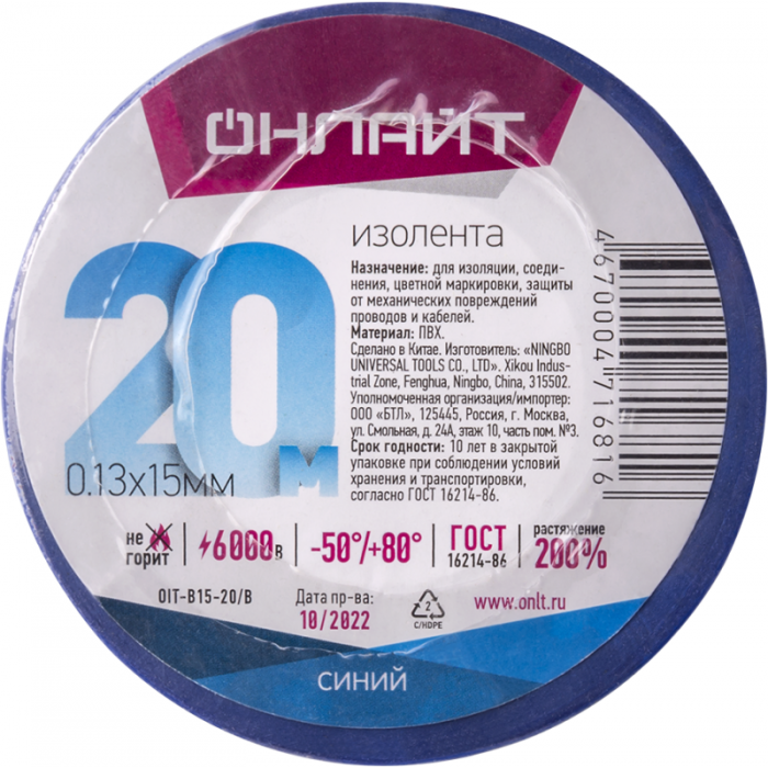Изолента ПВХ 15мм (рул.20м) OIT-B15-20/B син. ОНЛАЙТ 4670004716816 – аксессуар, средство изоляции. Представляет собой изоляционную клейкую ленту шириной 15 мм, толщиной 0,8 мм, изготовленную из термостойкого (до 80 С), самозатухающего поливинилхлорида, синего цвета.