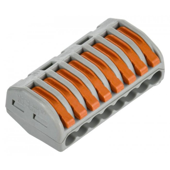 Клемма строительно-монтажная серии 222 предназначена для соединения одножильных и многожильных медных проводников без использования инструмента в электрических сетях переменного и постоянного тока. Клемма допускает многократное присоединение и отсоединение проводников. Количество подключаемых проводников - 8.