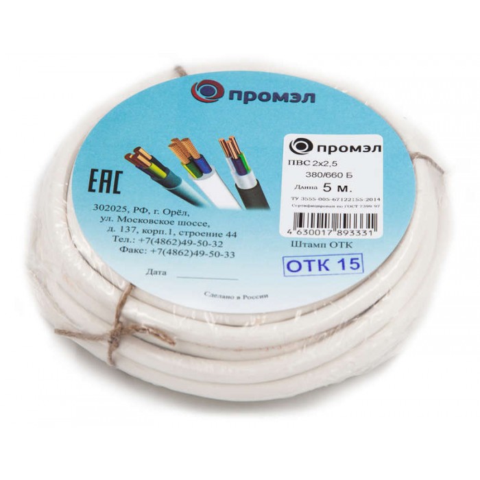 Провод ПВС 2х2.5 380В Б (бухта 5м) (шт) ПромЭл 13321520