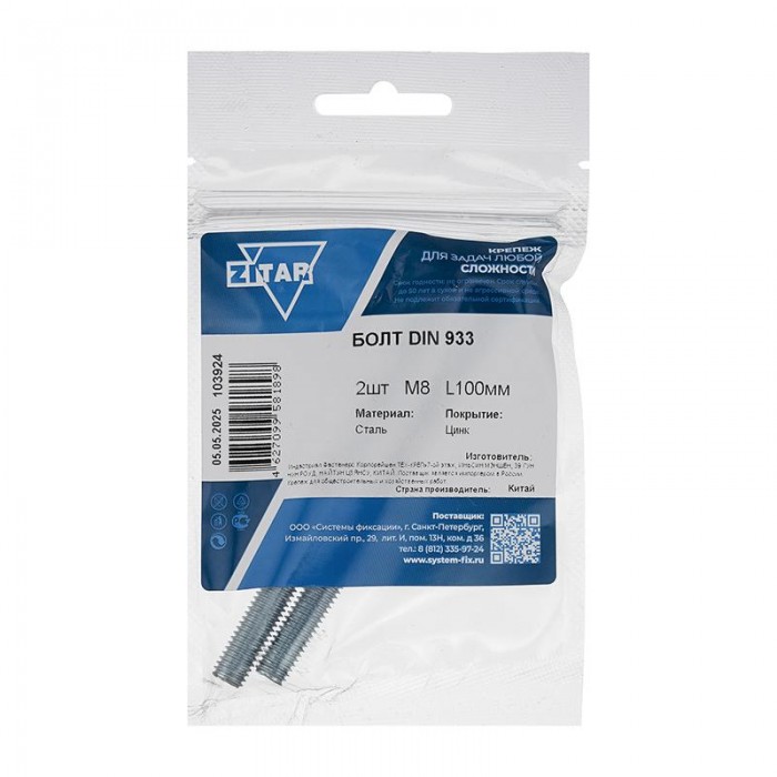 Болт с шестигранной головкой М8х100 DIN 933 оцинк. (уп.2шт) Tech-Krep/Zitar 103924