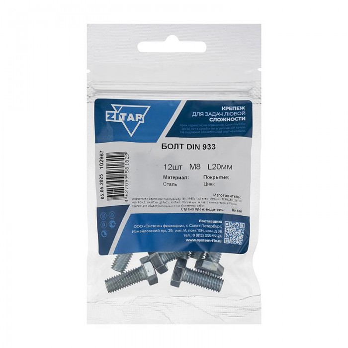 Болт с шестигранной головкой М8х20 DIN 933 оцинк. (уп.12шт) Tech-Krep/Zitar 102967