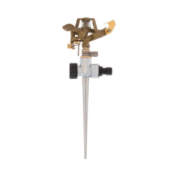 Разбрызгиватель представляет собой изделие, предназначенное для полива растений и почвы. Оснащен распыляющей головкой. Пользователь может дополнительно регулировать угол горизрнтального распыления до 16 метров. Конструкция позволяет создать сеть одновременно работающих распылителей. Типы распыления: одностороннее, полное или частичное. Расход воды – от 5,7 до 14,8 л/мин. Корпус устройства выполнен в форме пики, благодаря чему разбрызгиватель без труда вставляется в грунт и надежно фиксируется. Герметичное крепление шланга к разбрызгивателю осуществляется при помощи универсального соединителя, расположенного на корпусе устройства. Разбрызгиватель изготовлен из латуни, благодаря чему имеет высокие антикоррозийные свойства и устойчив к воздействию внешних факторов.
