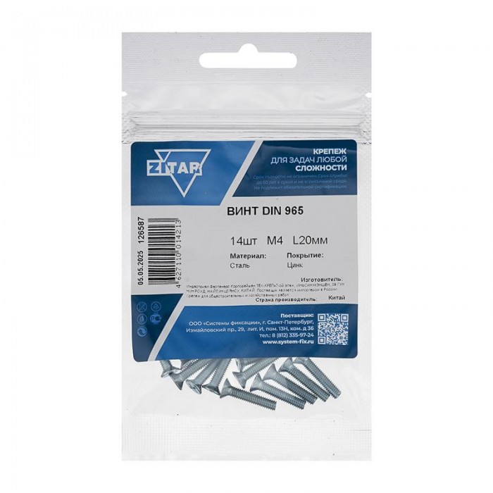 Винт с потайной головкой М4х20 DIN 965 оцинк. (уп.14шт) Tech-Krep/Zitar 126587