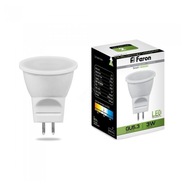 Светодиодная лампа Feron LB-271 изготовлена по новейшим технологиям на высококачественном оборудовании с применением полностью автоматической сборки. Корпус лампы выполнен из алюмопласта – это наиболее перспективная технология охлаждения светодиодов, которая обеспечивает максимальнонеобходимый теплоотвод, сохраняет эстетику и экономически выгодна по цене. Современная стильная упаковка выгодно смотрится на полке, а цветовое деление по температуре свечения и четкие яркие обозначения важнейших параметров позволят покупателям с легкостью ориентироваться в ассортименте. Лампа обладает высоким световым потоком 260Lm/270Lm/280Lm при мощности 3W и заменяет галогенную лампу типа MR11 мощностью 30W. Матовое стекло позволяет получить мягкий рассеянный свет, при этом яркость остается гарантированно высокой. Лампа предназначена для применения во встраиваемых светильниках и других осветительных приборах с цоколем G5.3 и рабочим напряжением 230V.