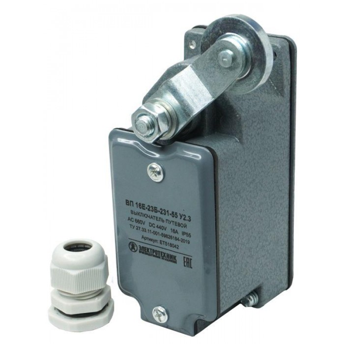 Выключатель путевой ВП 16Е-23Б-231-55 У2.3 1НО+1НЗ IP55 рычаг с роликом с сальником ход вправо самовозврат Электротехник ET518042