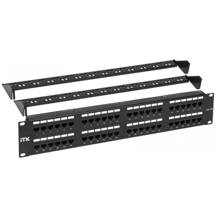 Коммутационные панели или патч-панели являются важнейшей частью любой СКС и IT-инфраструктуры здания и сооружения с большим количеством информационных розеток и терминальных портов конечных пользователей, которые необходимо коммутировать на порты активного сетевого оборудования, размещенного в серверных и распределительных узлах. В зависимости от способа крепления, масштабности кабельной системы, типа сети ITK изготавливает патч-панели для настенного монтажа или монтажа в 19-дюймовый конструктив, по количеству портов: 12-, 24-, 25-, 48-, 50-, категорий: 3 (телефонные), 5E, 6, 6A, в экранированном исполнении и без защитного экрана. Патч-панели для монтажа в 19" шкаф или стойку соответствуют стандарту 19" (482,6 мм), имеют отверстия с левой и правой стороны для крепления на профиль, производятся высотой 0,5, 1 или 2 юнита. На передней стороне все патч-панели ITK имеют специальную площадку для дополнительной маркировки и цифровую нумерацию портов, на обратной стороне модули IDC имеют цветовую и цифровую нумерацию. Также для облегчения монтажа и укладки кабелей имеются изделия с кабельным органайзером спереди или сзади. Патч-панели соответствуют международным стандартам UL 1863, ISO/IEC 11801:2002, TIA/EIA-568-B, кодировка проводников в соответствии с T568B и A. Поставляются в картонной коробке с крепежом.