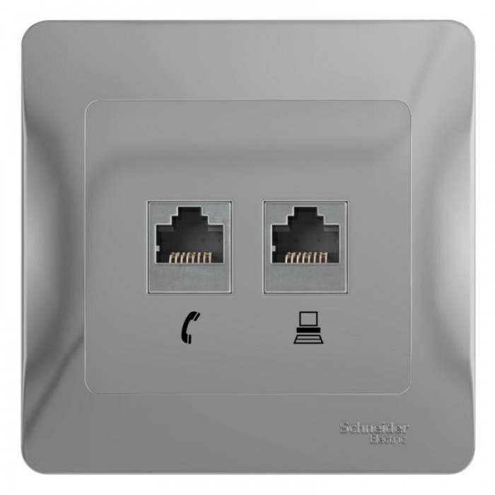 Механизм Systeme Electric (ранее Schneider Electric) серии Glossa (цвет алюминий) двойной розетки разъёмами RJ45 категория 5е и RJ11 предназначен для удобного и быстрого подключения вашего компьютера и телефона к соответствующим сетям. - Выполнен из материала PС+ASA, стойкого к УФ-излучению и появлению царапин.